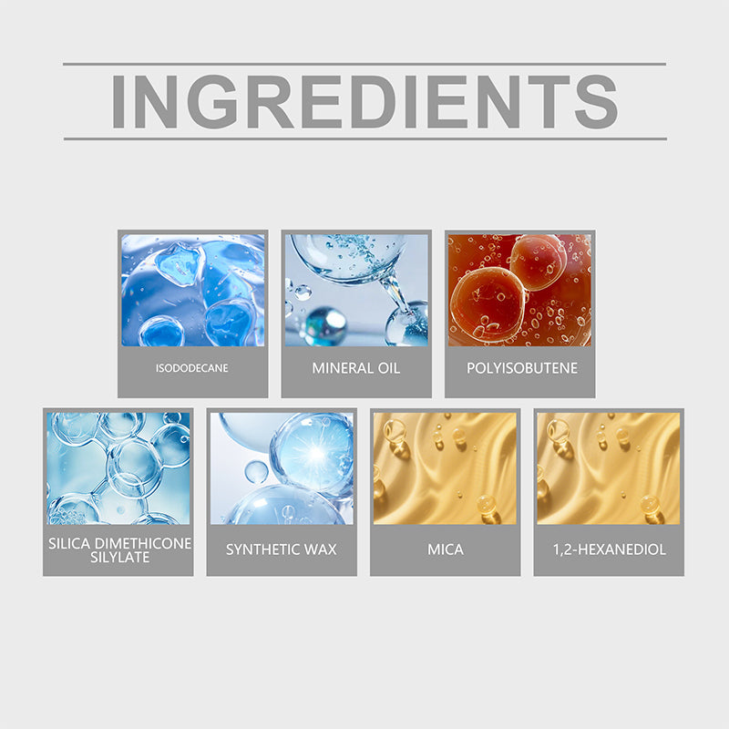 Ingrediente: Isododecano, aceite mineral, poliisobuteno, sililato de sílice dimeticona, cera sintética, mica, 1,2-hexanodiol